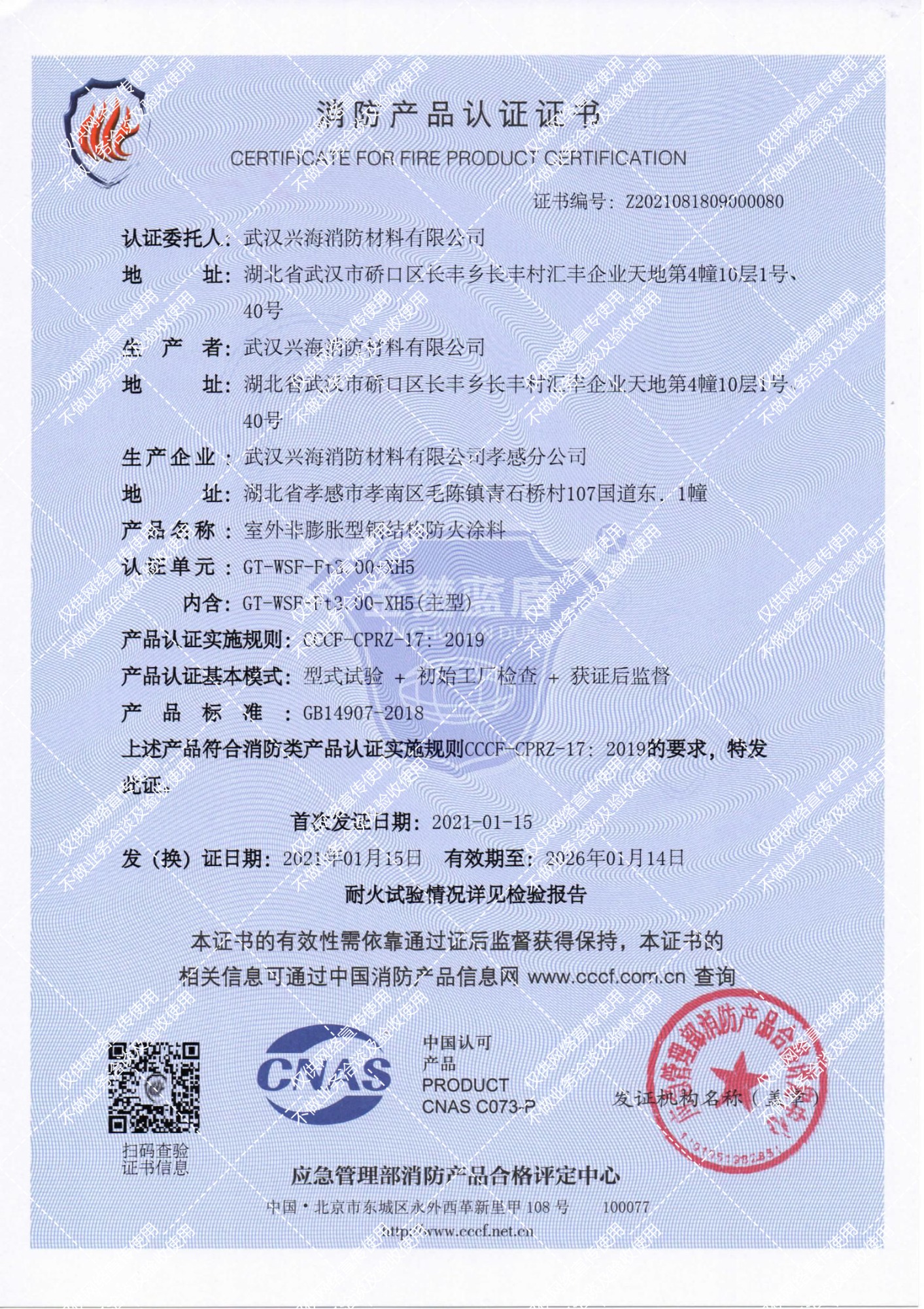 室外非膨脹型鋼結(jié)構(gòu)防火涂料消防產(chǎn)品認(rèn)證證書(shū)