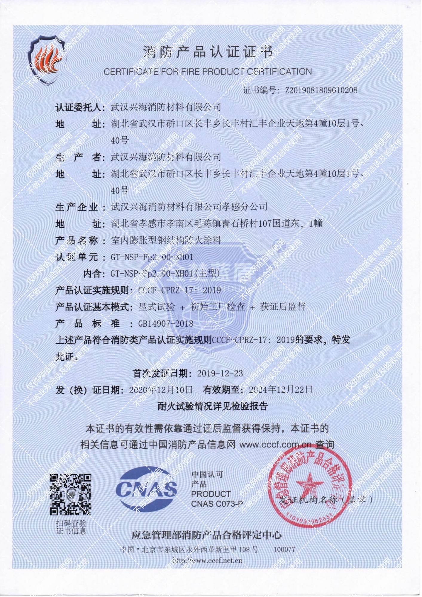 室內(nèi)非膨脹型2小時(shí)鋼結(jié)構(gòu)防火涂料消防產(chǎn)品認(rèn)證證書