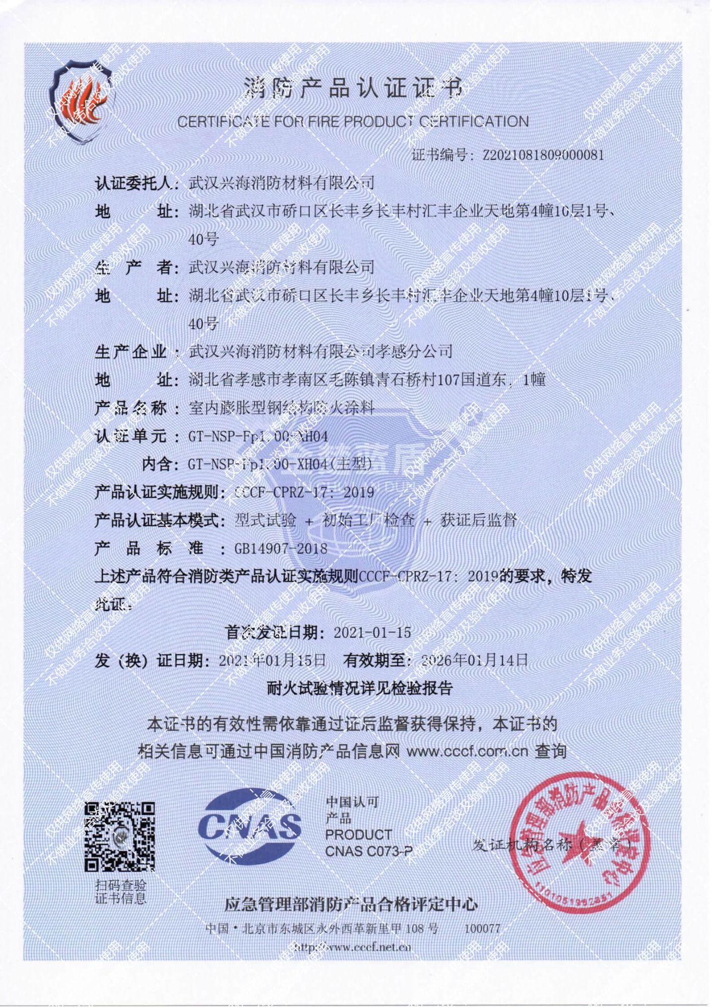 室內膨脹型(水基型)1小時鋼結構防火涂料消防產品認證證書