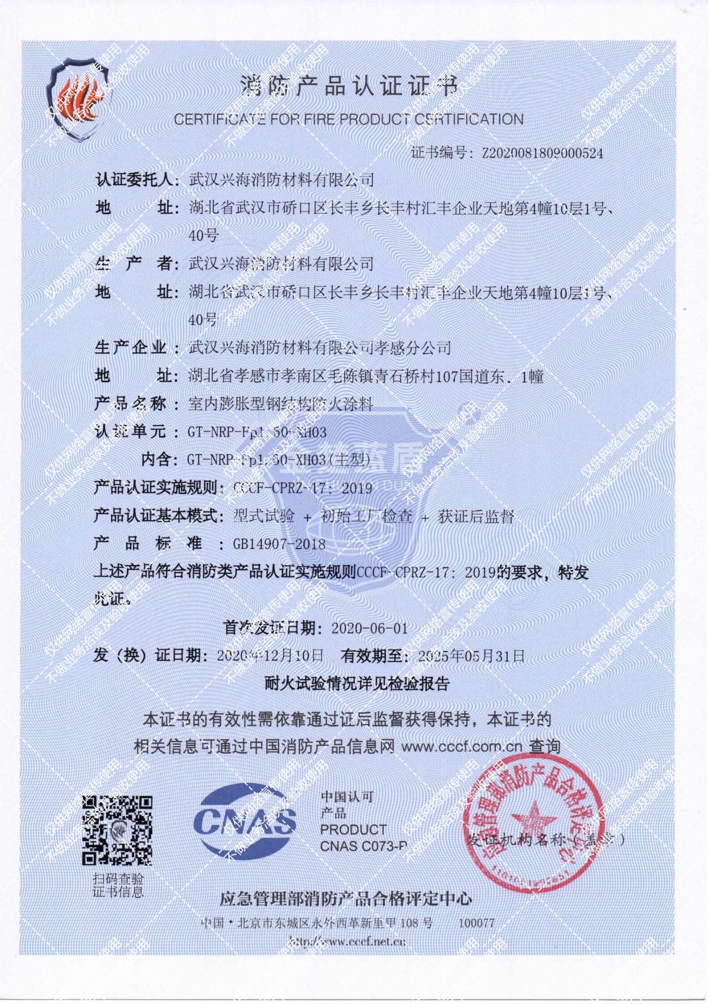室內(nèi)膨脹型(油性)1.5小時鋼結(jié)構(gòu)防火涂料消防產(chǎn)品認(rèn)證證書